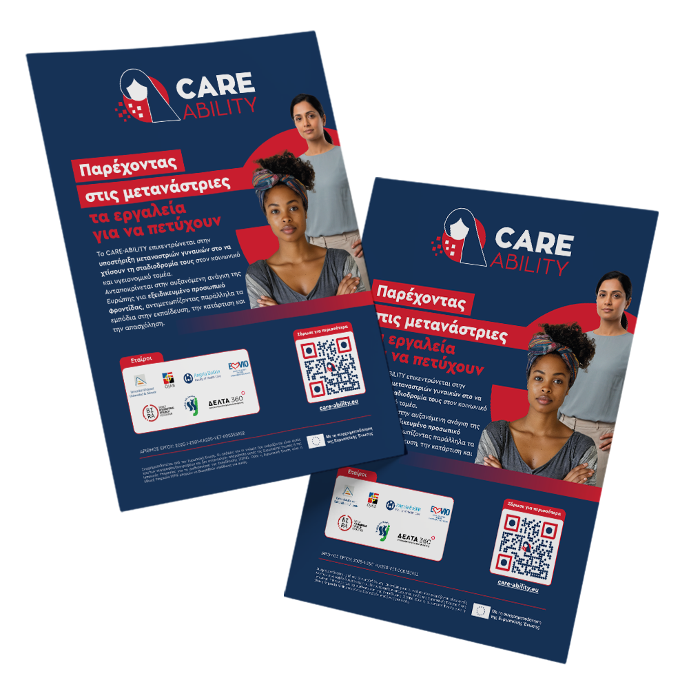 Εδώ μπορείτε να βρείτε όλα τα υλικά που δημιουργήθηκαν στο πλαίσιο του CARE-ABILITY — από αφίσες και φυλλάδια έως ενημερωτικά δελτία και διαφημιστικά βίντεο. Τα υλικά αυτά παρουσιάζουν την πορεία, τα αποτελέσματα και τον αντίκτυπο του έργου σε ολόκληρη την Ευρώπη και μπορούν να χρησιμοποιηθούν ελεύθερα για μαθησιακούς ή ενημερωτικούς σκοπούς.